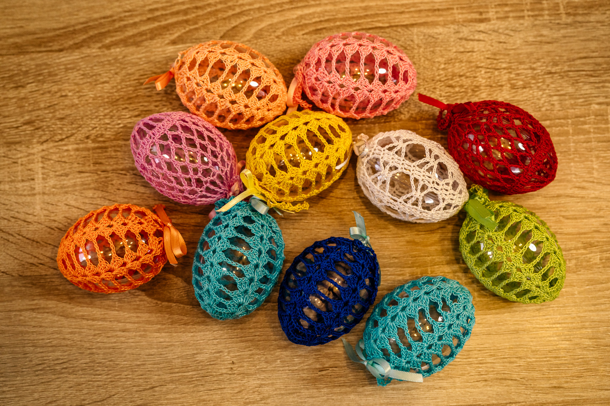 Crocheted plastic eggs, size 6 cm, various colors and motifs. The price is for a set of 3 eggs.
